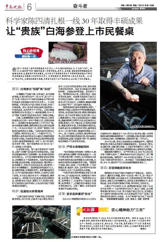 長(zhǎng)期輾轉(zhuǎn)于福建寧德、江蘇宿遷、省內(nèi)青煙威等地,扎根科研和生產(chǎn)一線(xiàn)30年,致力于“三農(nóng)”發(fā)展,中國(guó)水產(chǎn)科學(xué)研究院黃海水產(chǎn)研究所珍稀海洋生物繁殖與保護(hù)團(tuán)隊(duì)負(fù)責(zé)人、科學(xué)家陳四清,不斷實(shí)現(xiàn)水產(chǎn)品科研攻關(guān)突破,取得了豐碩成果。