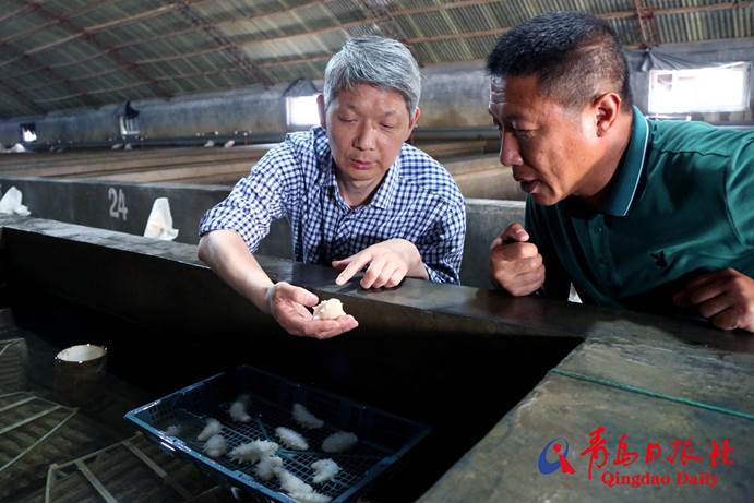 陳四清(左)指導(dǎo)養(yǎng)殖廠(chǎng)里的技術(shù)員如何提高白海參的生長(zhǎng)質(zhì)量。