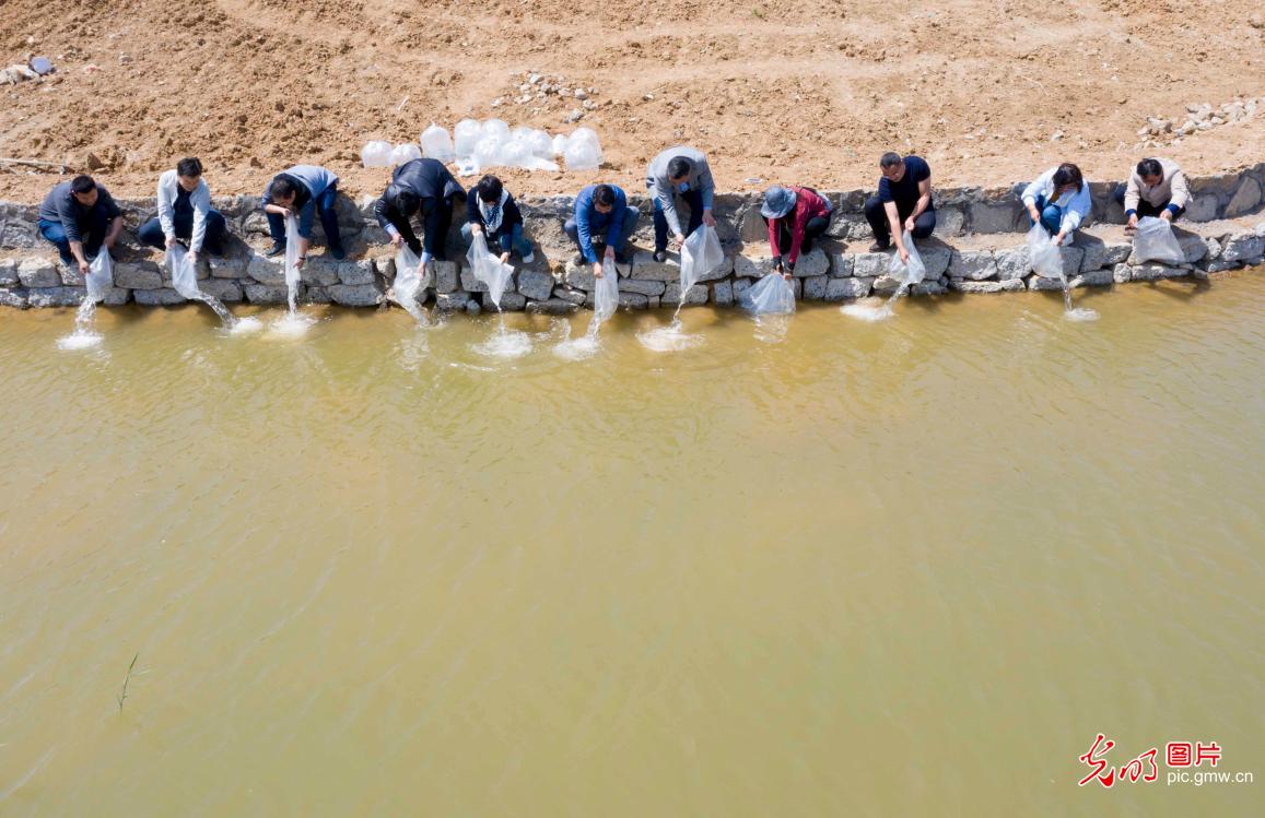 2021年5月5日,中國(guó)水產(chǎn)科學(xué)研究院黃海水產(chǎn)研究所的科研人員,在山東青島西海岸新區(qū)知山樂禾新田園公社,把2000尾嶗山仙胎魚(學(xué)名香魚)魚苗投放到園區(qū)的水系之中。嶗山仙胎魚是一種珍稀淡水魚,有"嶗山中華鱘"之美譽(yù)。(韓加君攝/光明圖片)