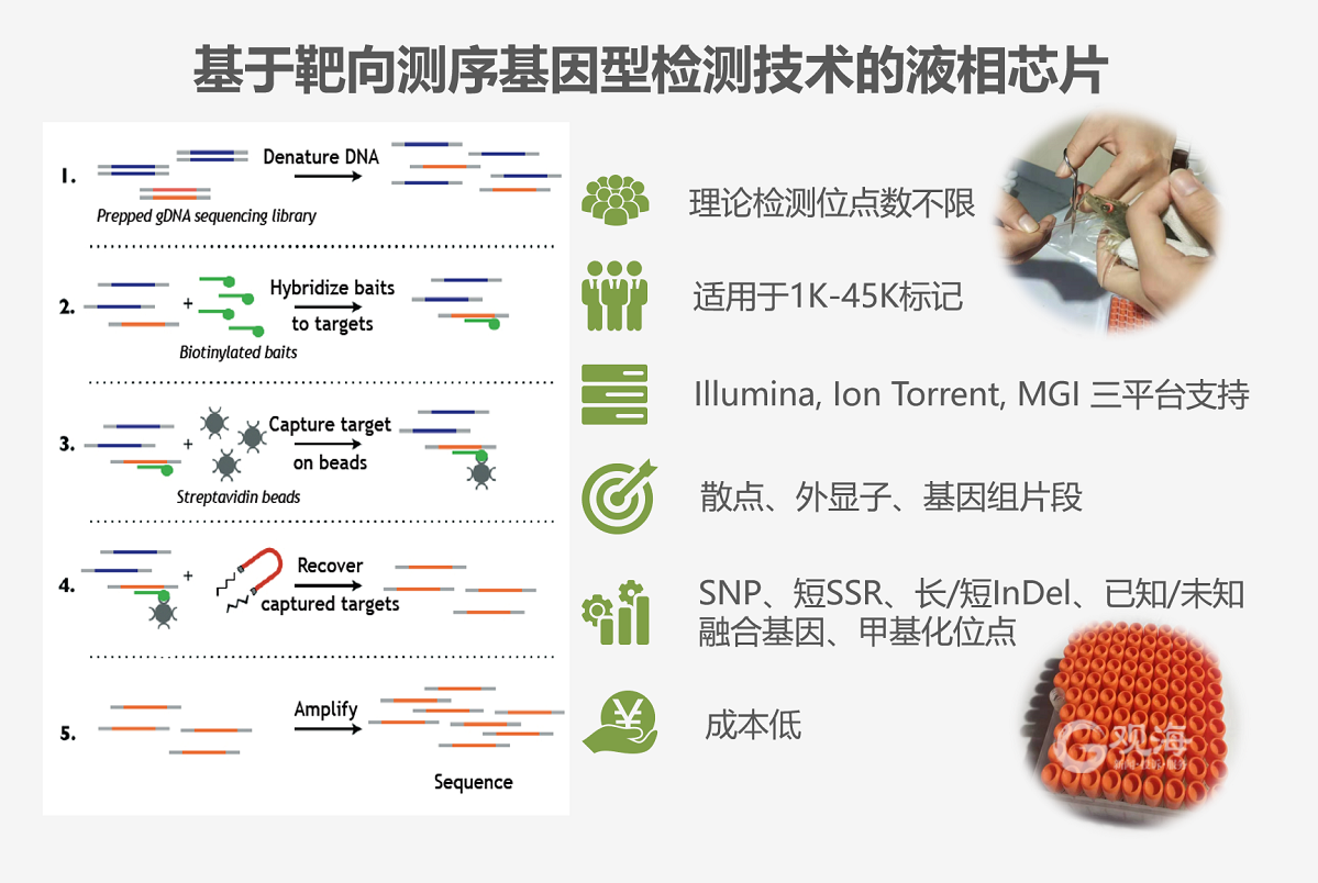 液相基因芯片,將原本需要通過光刻技術(shù)固定在硅片上的數(shù)萬種生物探針濃縮在一個小液滴里,實現(xiàn)DNA分子的靶向捕獲,并獲取DNA序列信息。液相芯片國內(nèi)擁有自主知識產(chǎn)權(quán),打破國外技術(shù)壟斷,是育種用得上、用得起、用得好的技術(shù),使基因型檢測不再成為中國分子育種的技術(shù)瓶頸,成為高通量、大規(guī)模、超低成本的基因型檢測中國“芯”?;蛐酒赏瑫r對大量基因和遺傳信息進行快速精準的檢測和分析,是提升育種效率、培育抗病、抗逆及優(yōu)質(zhì)等新品種的重要分子工具。