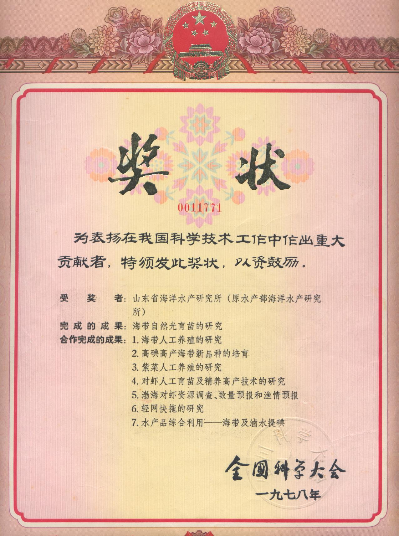 “海帶自然光育苗的研究”1978年獲全國(guó)科學(xué)大會(huì)獎(jiǎng)